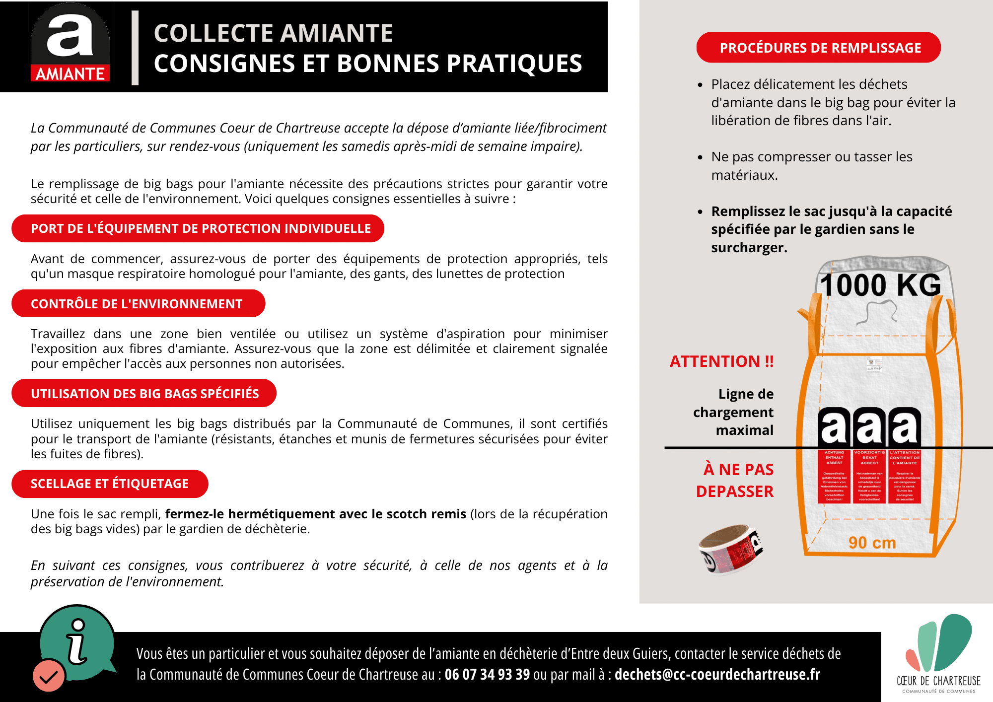Pour la dépose d’amiante liée/fibrociment et pour la récupération des contenants d’ensachage (sacs), prenez rendez-vous auprès du service déchets du Cœur de Chartreuse au 04 76 66 65 24 ou par mail à : dechets@cc-coeurdechartreuse.fr