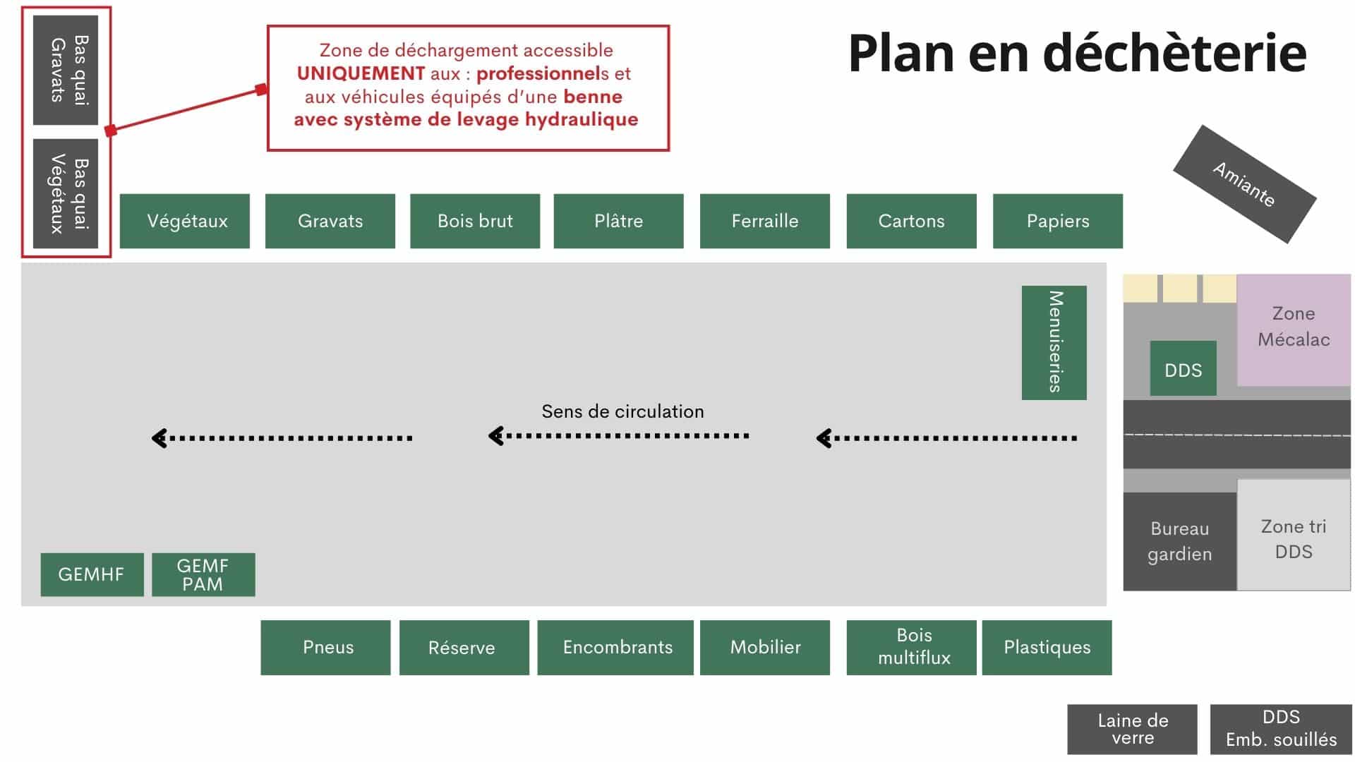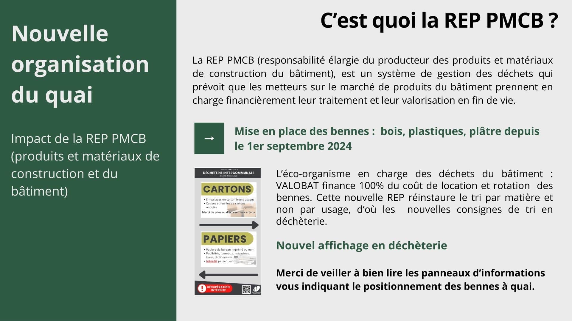 Suite à la mise en œuvre de la REP PMCB (responsabilité élargie du producteur des produits et matériaux de construction du bâtiment) l’organisation du quai et les consignes de tri ont évolué en déchèterie d’Entre deux Guiers.